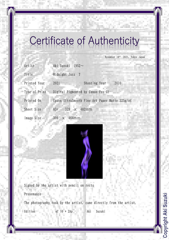 AkiFoto の作品にはこのようなエディション証明書が付属しています。証明書には証明書の発行日・作家名・撮影年・制作年・紙質・サイズ・作品の来歴・エディション数・作家の実筆サインが記載されています。