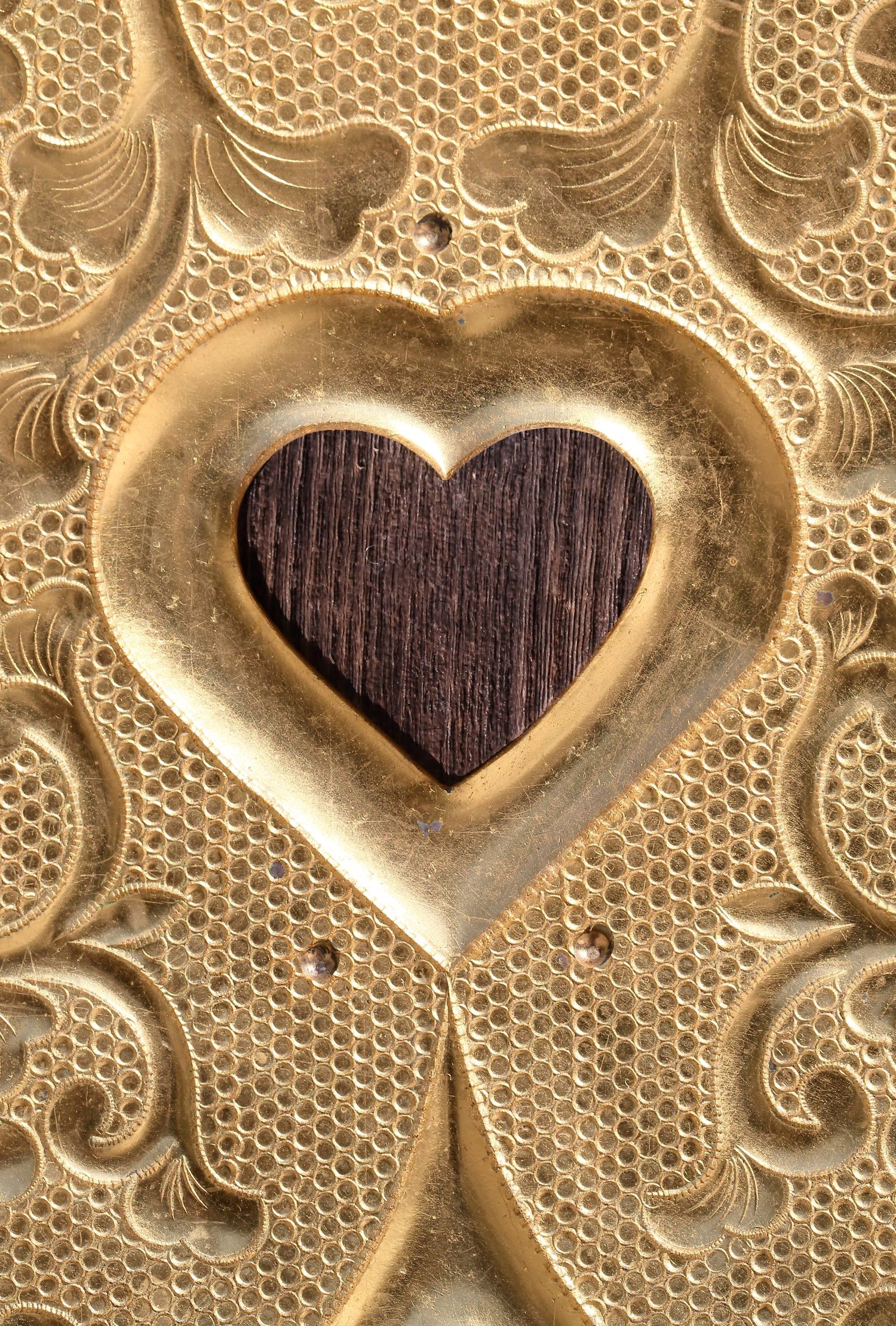 東方見聞録の黄金の国ジパングを即座に連想した。この金飾りは東京都府中駅近くの大国魂神社の中雀門の柱の沓巻。唐草模様はイスラムのイメージが濃い。ハートマークは古代ローマの遺跡にもあるが、中世以降にキリストの心臓のシンボルとしてヨーロッパで使われるようになったという。この逆さハートは日本では猪の目と呼ばれこちらも結構古く飛鳥・奈良からすでにあった。魔除けのシンボルなどの諸説あるが中華古来の五行説から(亥→水→)火除けにも多用されてきた。日本古来の「和」の気分が身近に味わえる社殿にもイスラム・中国・キリスト教文化の断片が見え隠れするハート。ともあれ今ではその優美な形は愛の象徴として君臨して、万人から好まれている。
